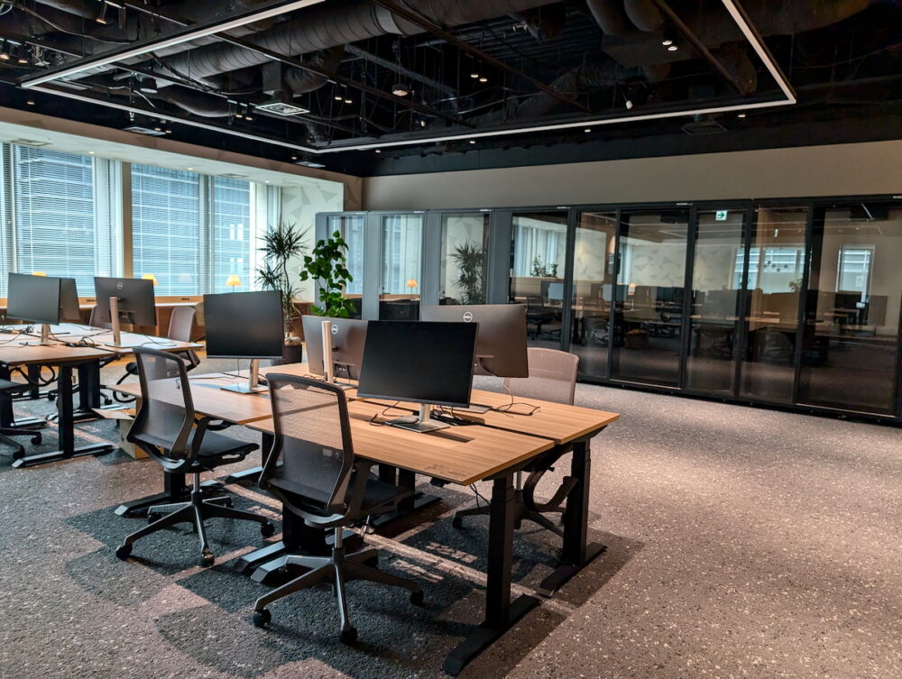 個々の座るデスクは『ホットデスク』と呼ばれており、良いワークチェアと、外部ディスプレイが備え付けられており、そこに自分のノートパソコンを接続してログインする。
