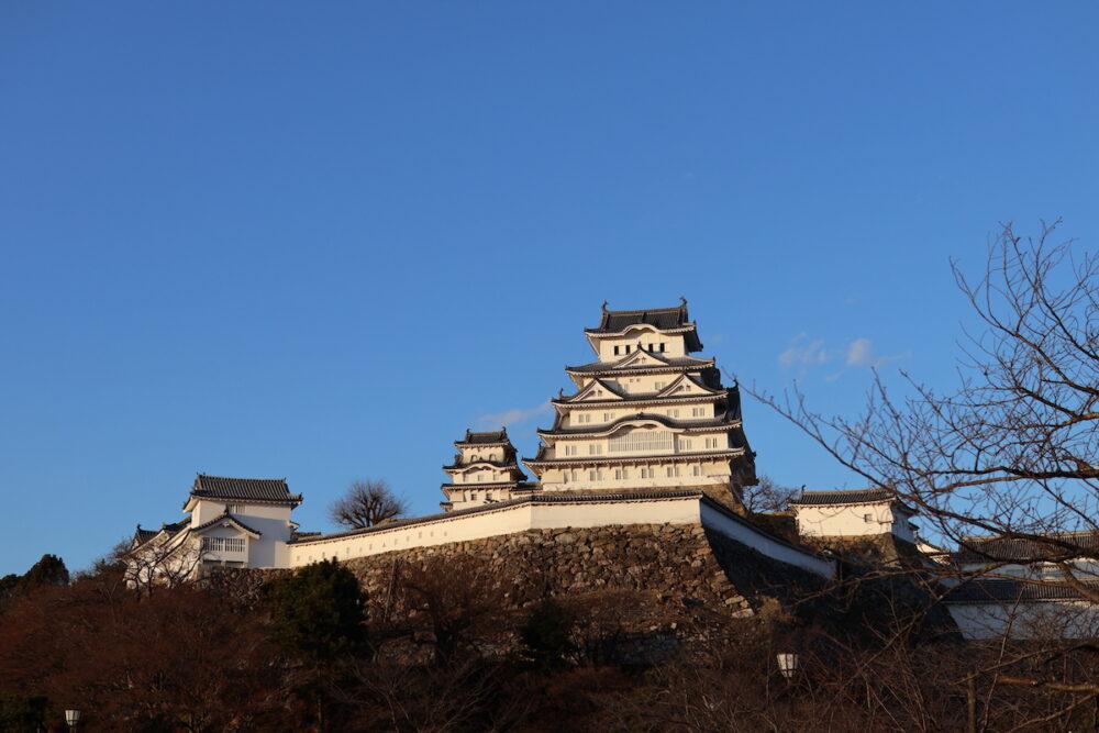 遠景を撮ってみた。夕焼けの光を反射して少しオレンジがかった色に染まる姫路城。しっかりとシャープに描けているので、風景を撮るのも楽しい。
