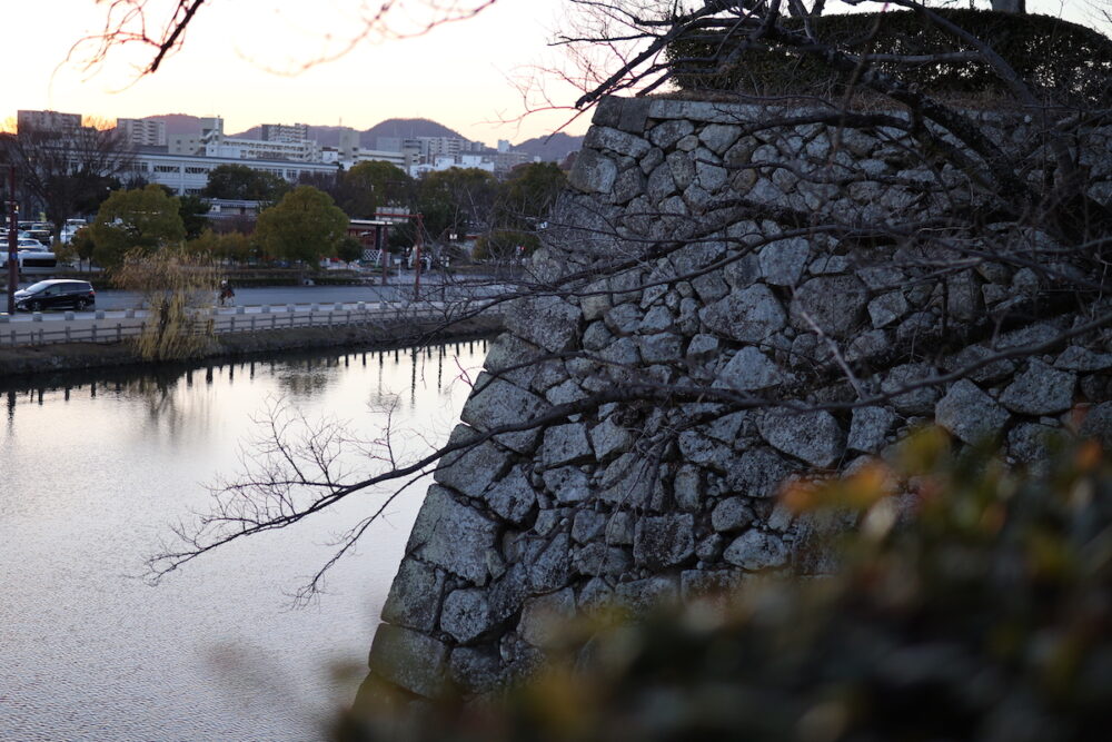 続いて、夕暮れの姫路城の石垣。前後の風景を適度にぼかしてくれるので、主題である石垣に目が行く。