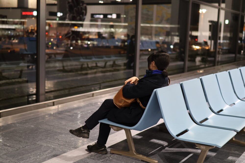 35mm判換算で約50mmという画角はとても扱いやすい。これから旅立つために羽田のターミナルのイスに座る娘を撮った。暗い場所でもなんなく撮れるのもこのシステムの魅力。