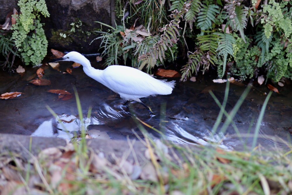 緑道の横の溝を闊歩するサギ。ちょっと暗くて、サギは動いていたのだが、R10の、鳥であっても目を追ってくれるAFのおかげで、目にピントが来た。