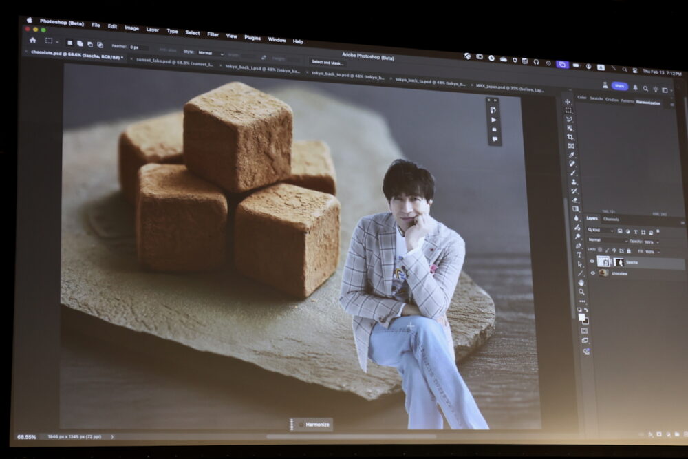 ちょうどバレンタインデー前日だったので、チョコレートの画像に、司会のサッシャさんの写真(「なんか、写真1枚送ってくれって言われたのは、これに使うのか!」と驚いてらっしゃいました)を切り抜いて重ねる。ちなみに、今や切り抜きも『Remove Background』のワンクリックで終了する。