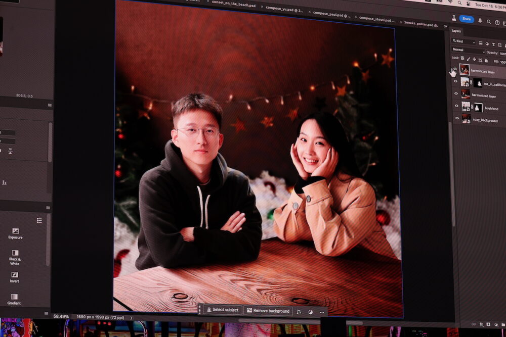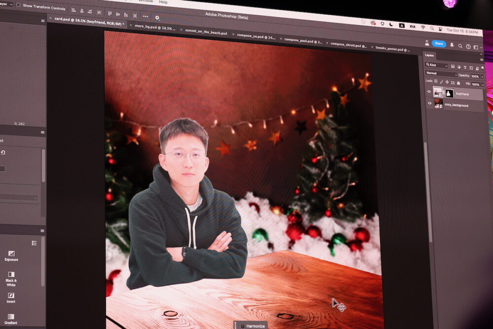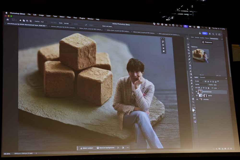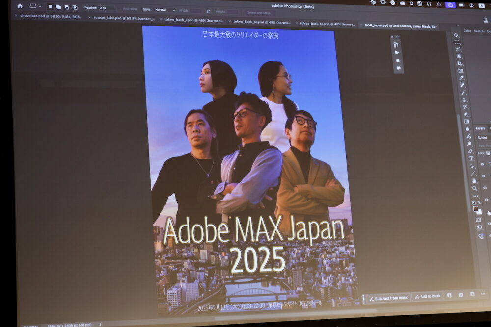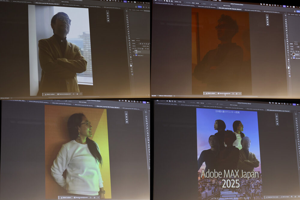 続いては、アドビの日本法人のスタッフの方の写真を集めて……いや、いくらなんでも写真がひどい。逆光とか、暗い場所とか、緑かぶりとか……。それを、夕焼けの東京の写真に乗せて『Remove Background』で切り抜き。しかし、これではポスターにはならない(笑)