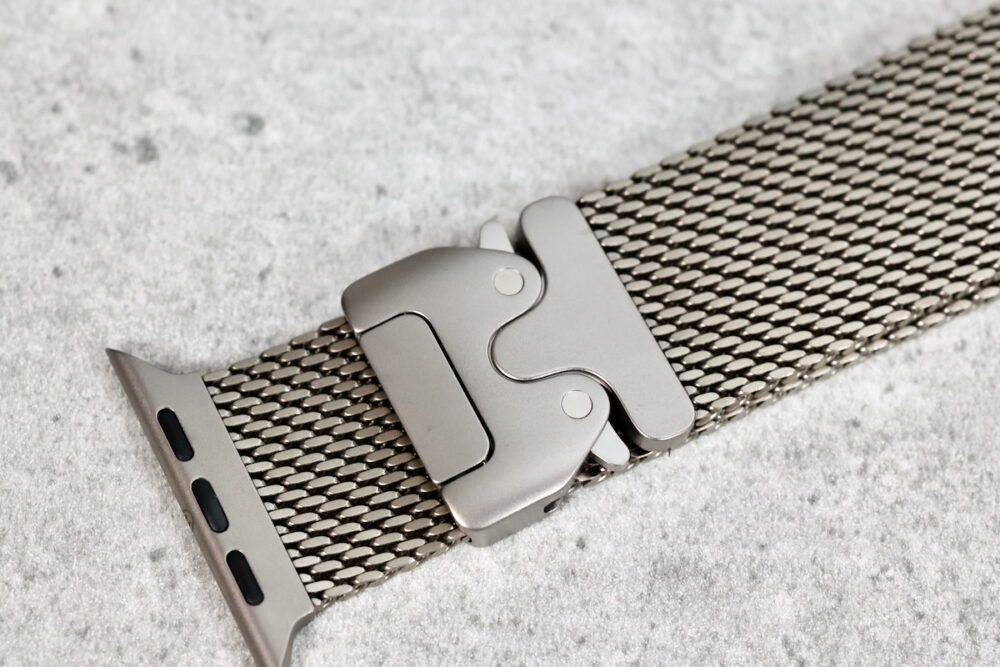 1番最初のApple Watchの時にミラネーゼループを買ったんだけれども、長いことを使ってるうちにミラネーゼループの磁力が弱まるのか使ってるうちに、少し緩む感じが好みでなかった。またミラネーゼループはステンレス製なので、少々重い対して、このチタンのループで驚くのはその軽さだ。何しろしたんだから軽いそして見た目よりずっとしなやかな動き。表側もフラットな形状に整形されているのでなめらかだ。装着する時もカチっとハードにロックされるし、長さを調整する。気候も自由な長さに細かい単位で調整できるので非常に便利。