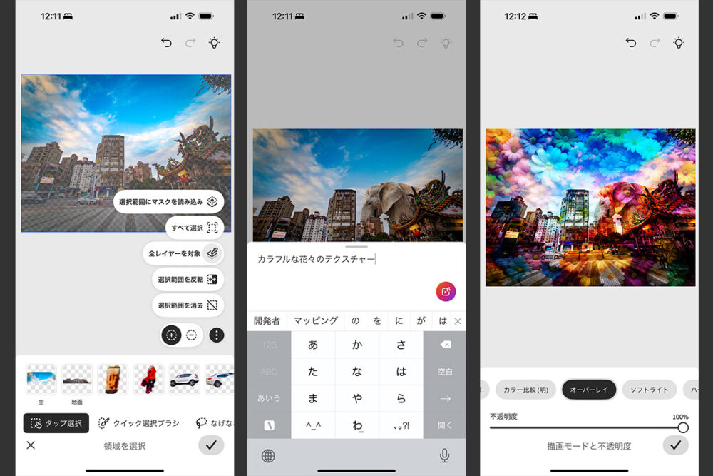 さらに、Adobe Fireflyを使った『生成塗りつぶし』や『生成拡張』を使えるので、簡単なテキスト入力で画像の補完や修正ができる。例えば、不足している背景を補完したり、画像の一部を拡張したりといった操作がiPhoneだけで可能になるのだ。