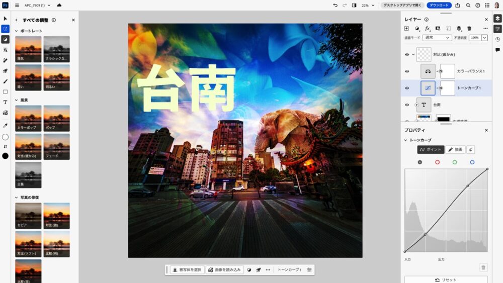 Photoshopの核となるレイヤー機能を搭載。ただし、パスやマスクを切るのも、Adobe Senseiを活用することでワンタッチ。レイヤーのブレンドモードや透明度の調整にも対応し、プロフェッショナルな作業が可能だ。マスク機能を活用することで、影響を及ぼしたくない部分を非破壊で隠しながら編集できるため、より自由度の高いクリエーションが実現する。