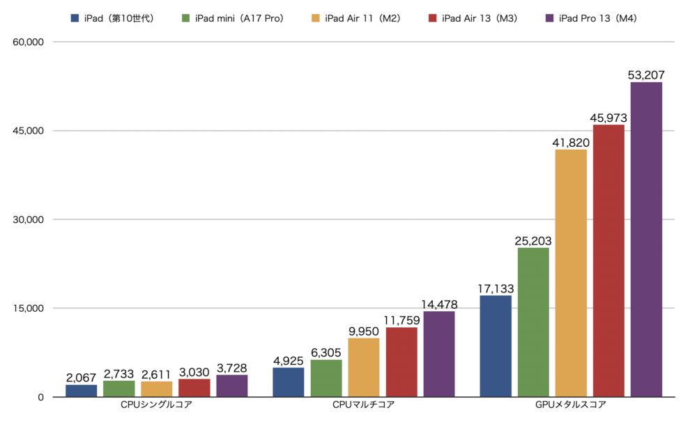 搭載されたM3のGeekbench 6でのベンチマークを、現行他機種(手元データのiPadはまだ第10世代だが)と比べてみよう。