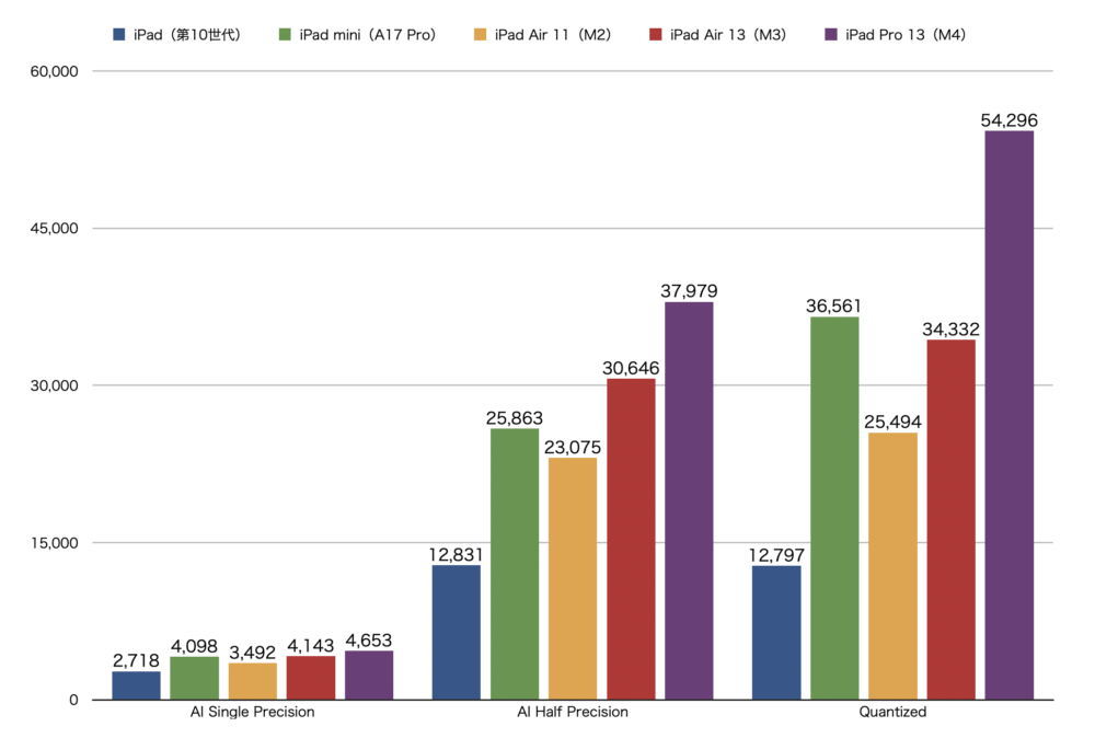 おそらくApple Intelligenceの性能は、半精度(Half Precision)や量子化(Quantized)が大きく影響するようなのだが、新しい世代のチップセットほど大きく伸びる傾向にあることに注目されたい。つまり、アップルがApple Intelligenceに必要な要素を、最新のチップセットにどんどん盛り込んでいるということだ。特に、iPad mini(A17 Pro)の性能が高いところが興味深い。これは、A17 ProがM3と同じ3nmプロセス(N3B)で生産されていることから来ていると思われる。つまり、5nmプロセス(N5P)のM2チップより、A17 ProのNeural Engineの方が処理能力が高いということなのだろう。