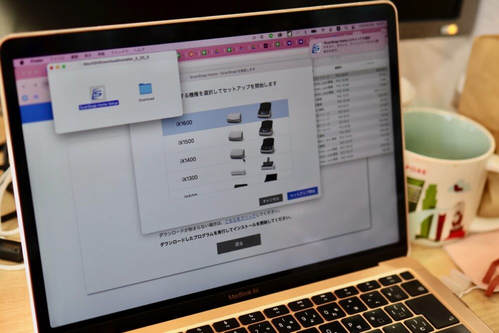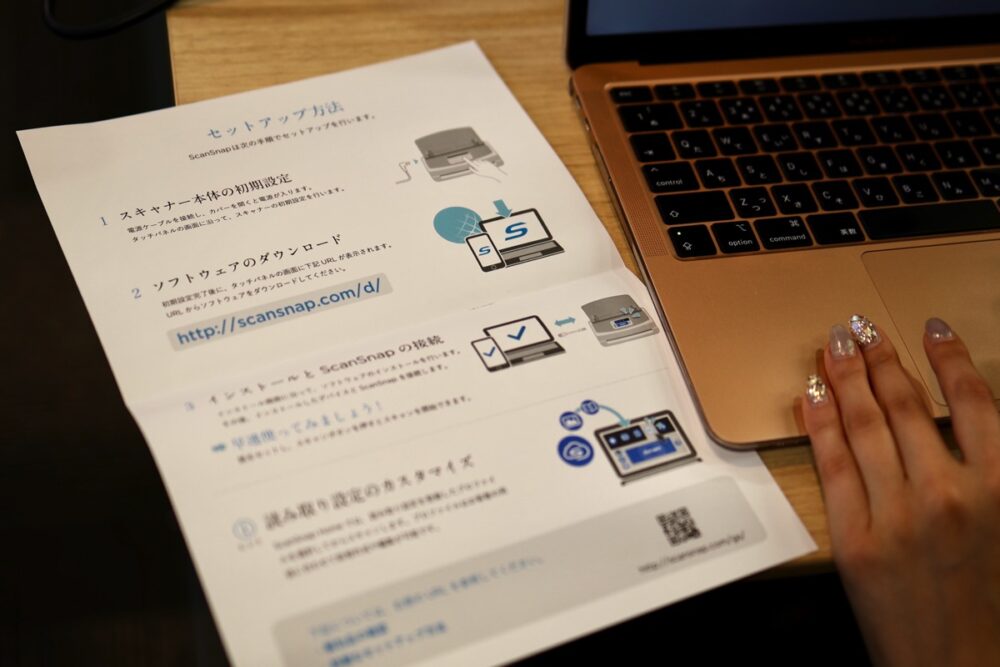 箱を開けると、とても簡単なインストラクションが付いてくる。電源を繋いで、パソコンやスマホにソフトウエアをダウンロードすれば、あとはそのアプリの指示に従えばOK。最初に有線で接続すれば、Wi-Fiの設定もパソコン側からScanSnapにコピーされるなど、非常に簡単に初期設定が行えるようになっている。