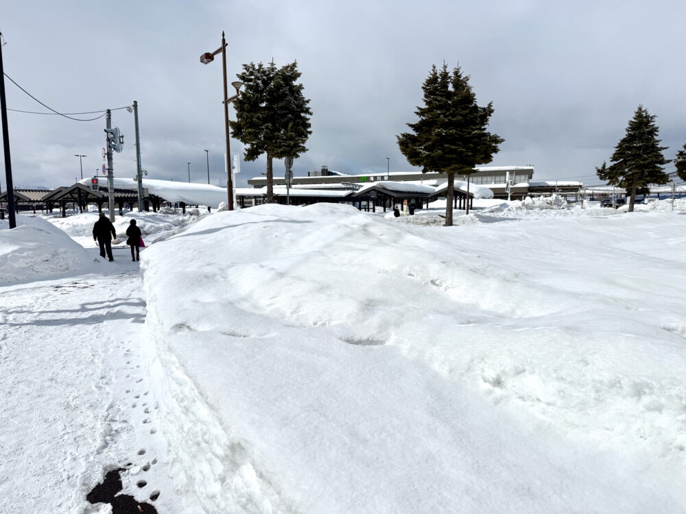 駅前で軽く食事でもしていこうかと思ったが、そもそも店なんか見当たらない。コンビニもない。それより、雪がスゴイ。歩道の左右にどけられた雪が高く積もっている。