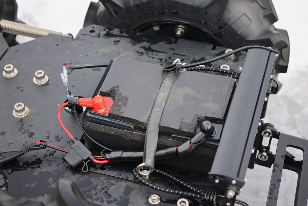 まず、このドローンを動作させているバッテリーは、リポやリチウムイオンではない。鉛のディープサイクルバッテリーだ。リポやリチウムイオンは、寒冷地で動力用バッテリーに使うのは困難だ。通常の鉛バッテリーは大きな範囲で充放電を繰り返すのは難しい。そこで鉛のディープサイクルバッテリーを利用するというわけだ。