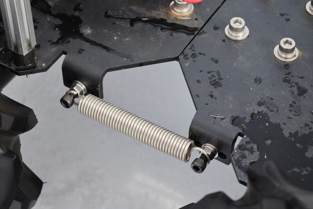 構造としては、車両中心縦方向に軸があり、左右をスプリングで固定するシンプルなもので、重量増の心配もない。