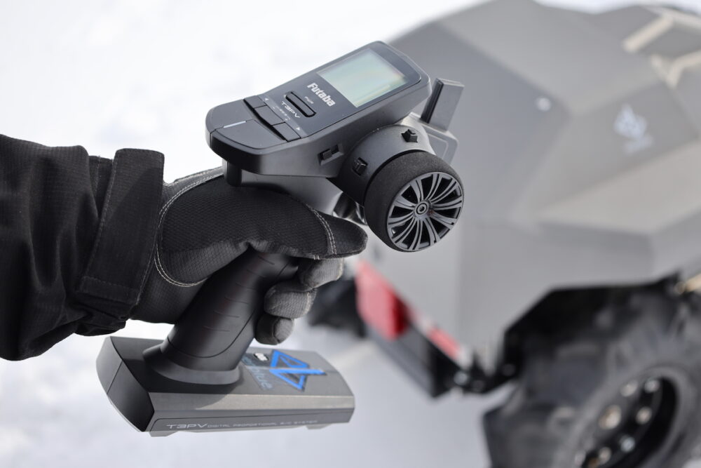 現状、本機は、ホイール式のFutabaのラジコン用プロポで操縦する。人間が操縦していては人員削減にはならないが、少なくとも楽ではある。さっきの重労働にくらべればラクチンだ。