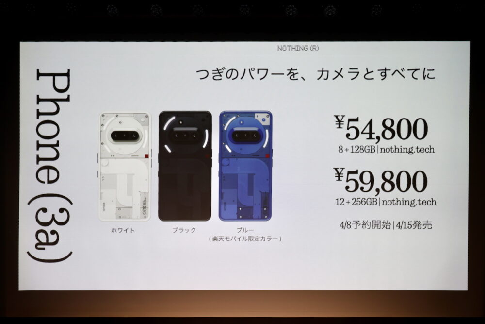 また、今回ホワイトとブラックの他にブルーのモデルが用意された。ブルーのモデルはNothing Phoneとしては初めてのキャリアとの提携モデルとして、楽天モバイル限定カラーとされた。