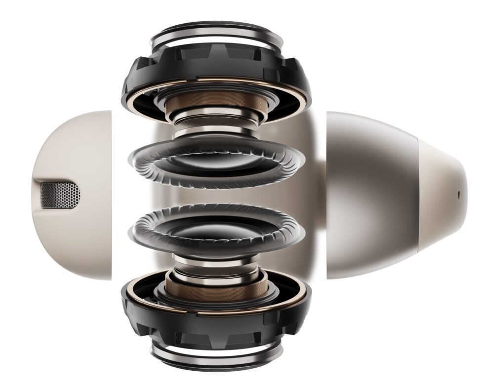 この課題に対して、OpenDots ONEは「水滴型のスピーカーボール内に、完全対称で外径が11.8mmの円形スピーカーを2つ配置し、2つのスピーカーが協力して1つの16mm外径のドライバーと同等の出力を確保するようにしました。これにより、強力な低音出力を確保します。2つのドライバーユニットを積み重ねることで球形の外輪郭が形成され、全体のスピーカーボールの体積を効果的に小さくし、小さな体積で大きなエネルギーを実現しています」という。この技術を同社はBassphere™技術と呼んでいる。
