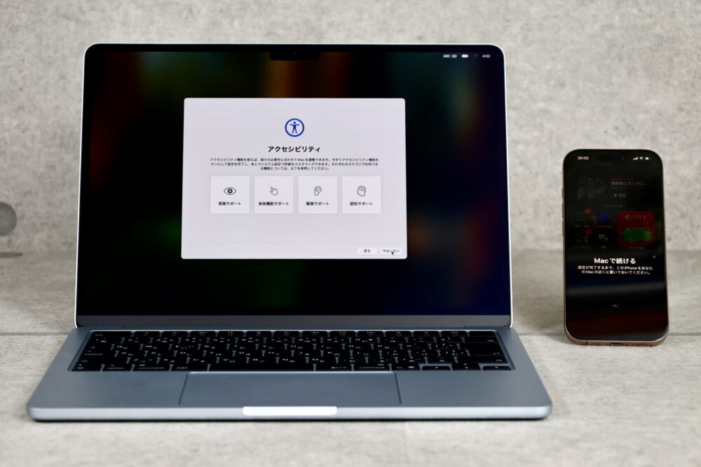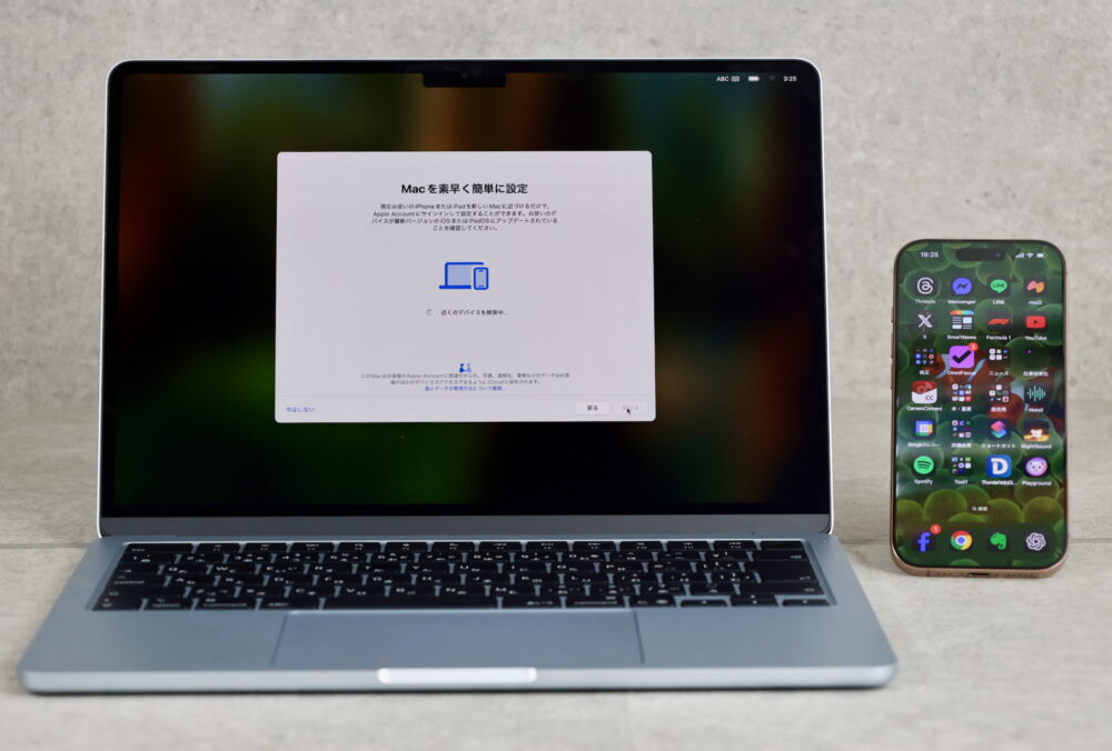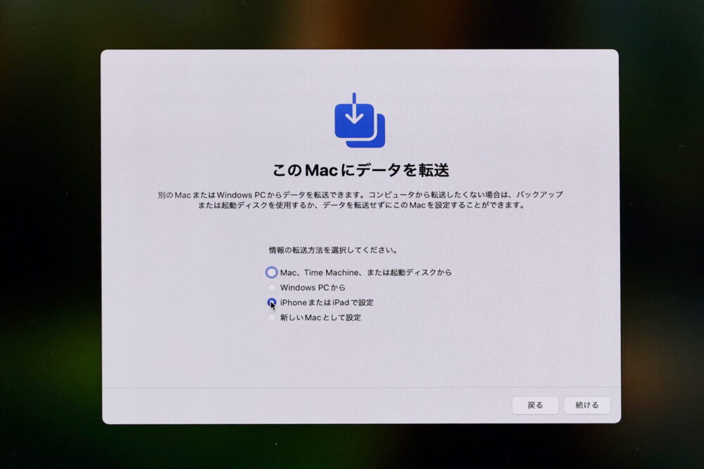 まずは、購入したMacを開き、国と言語を選択すると、何からデータを転送するかの選択肢が表示される。ここで、従来と違って『iPhoneまたはiPadで設定』という項目が現れる。