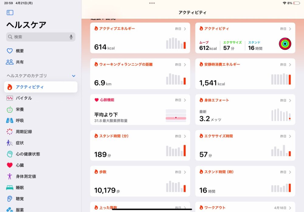 歩行非対称性が急に上がった場合(急に左右のバランスが悪くなった場合)、脳梗塞の予兆である可能性がある。おそらくApple Watchはそれを通知してくれるはずだ。心肺や、睡眠、聴力など、その他にも数多くのデータが保持されており、いまでも異常値が計測されるとアラートが出るし、これらのデータが今後役に立つかもしれない。
