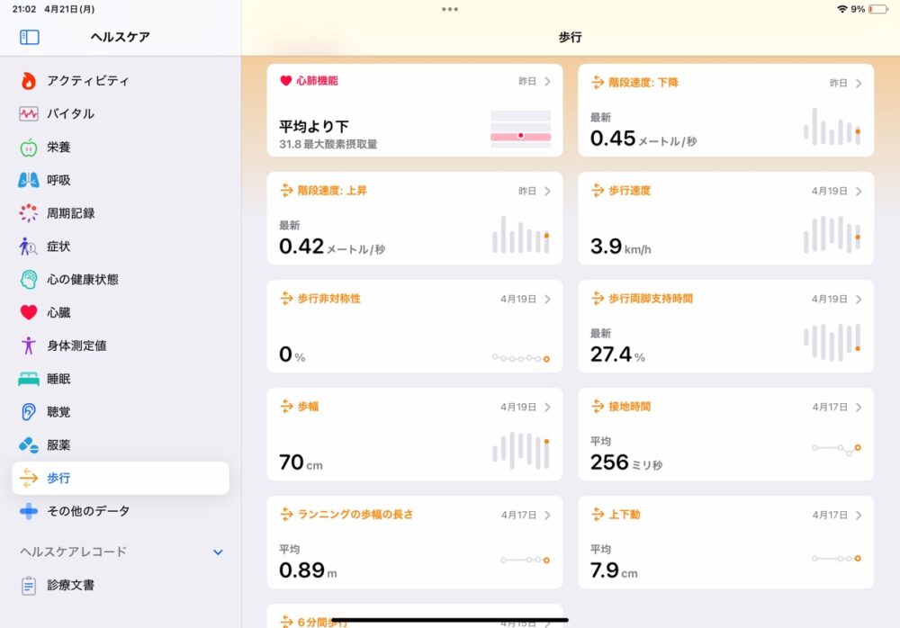 歩行速度、階段昇降の速度、歩行非対称性、歩行時両脚支持時間、歩幅、接地時間、ランニングの歩幅の長さ、上下動、6分間歩行の速度……などが細かく残っていく。