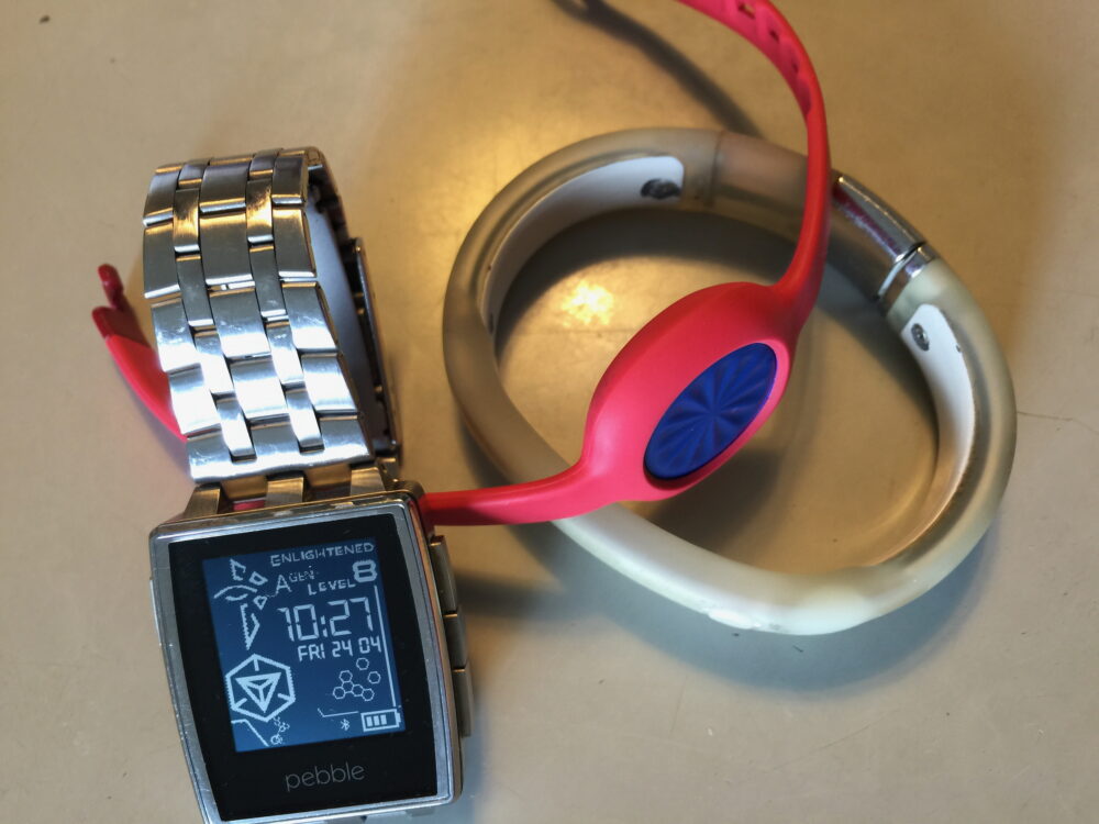 これは、Apple Watch登場以前に筆者が使っていたデバイス。Nike Fuel BandとFitbit、そしてpebble steel(Ingressのウォッチフェイスを使っているのがまた懐かしい)。