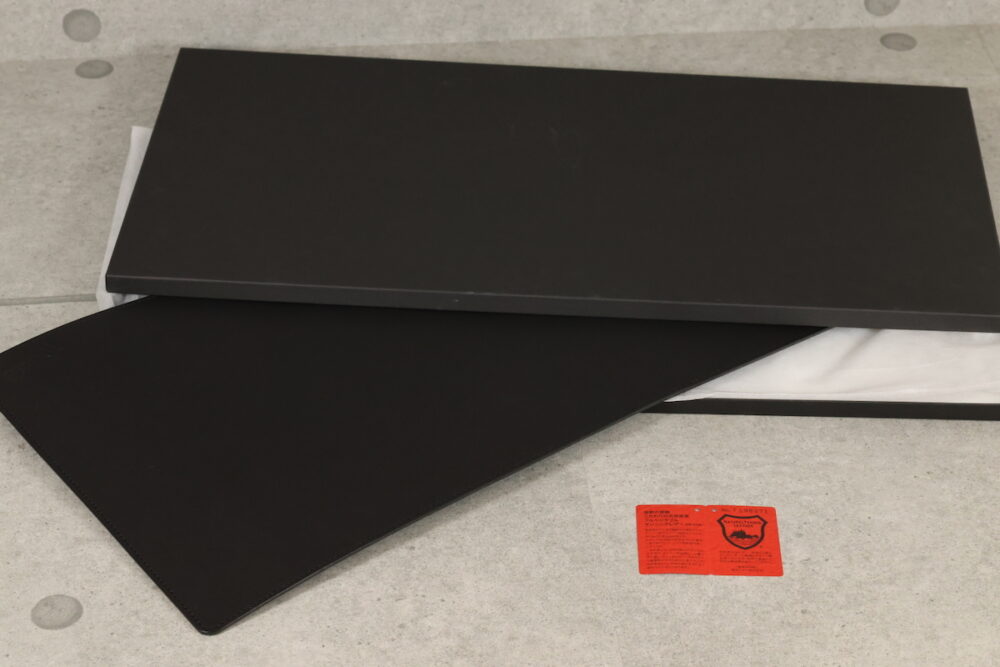実は、ロールされて来ると思っていたのだが、なんと大きな箱に入って送られてきた。ダンボール箱を開くと、中には黒い箱が。その中に不織布に包まれたHHKB栃木レザーデスクマットが入っている。サイズは60×30cmで、厚さはノギスでの実測になるが、3.8mm。かなり厚くて固い感触だ。