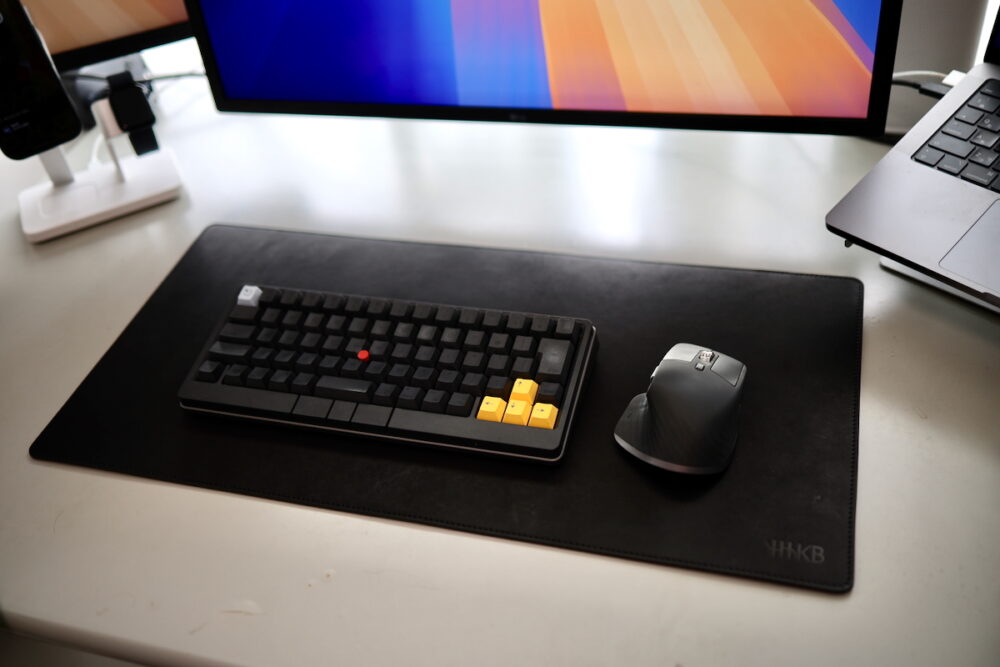 レザーのクッション性で、打鍵音も穏やかになる感じがするし、キーの打鍵感も少しまろやかになるように思う。このレザーマット1枚でHHKBの打鍵感まで変化して感じるのには驚いた。