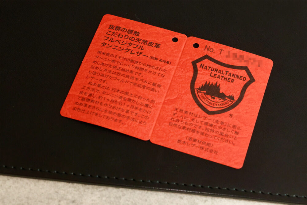 ちゃんと、栃木レザーが仕上げたフルベジタブルタンニンレザーとして、シリアルナンバー付きのタグが付属しているのもすごい。保管方法や、手入れ方法のアドバイスまで記されている。
