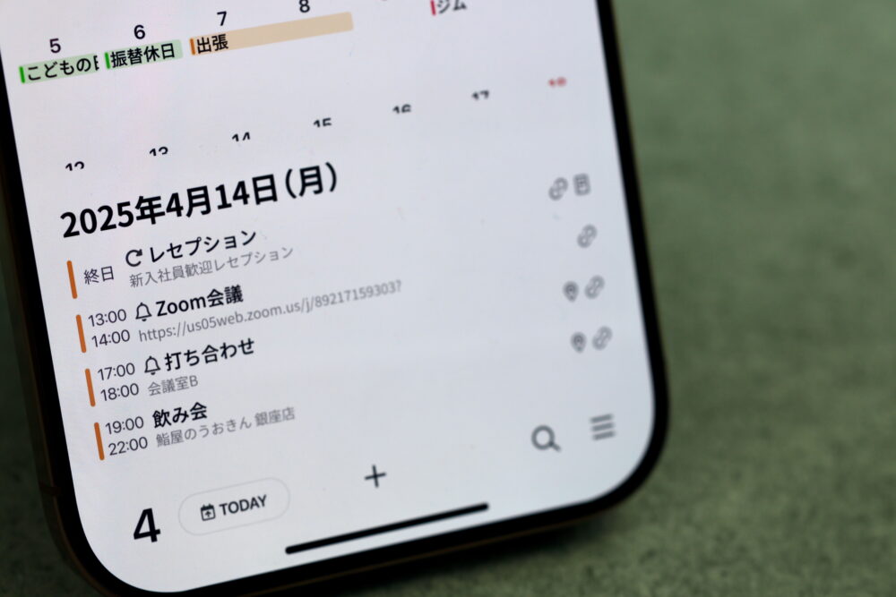 このアプリはご覧のように、月表示とリスト表示が組み合わされており、月表示の方でも4.5文字ぐらい(iPhone 16 Proの場合。画面サイズによって違うかも)見えるようになっているので、全体のスケジュールを見ながら、その日の個別のスケジュールが見られるようになっている。これがすこぶる便利。