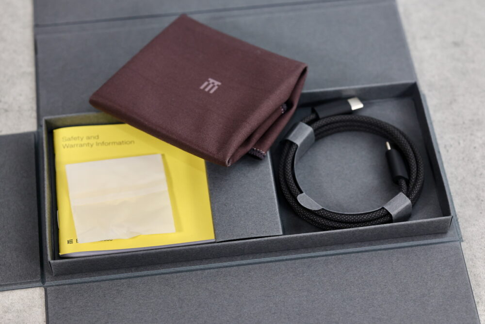 ちなみに、ちょっと分かりにくいが、メガネケースの下に、USB-Cケーブルと、メガネ拭きが入っている箱があるので、見落とさないように。ないと困るというものでもないが、USB-Cケーブルは上質なものが入ってるので、ぜひ活用したい。
