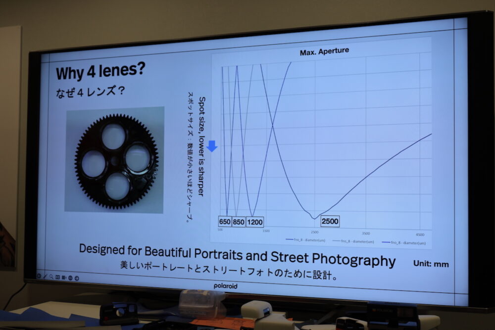 対して、Polaroid Flipは4枚のレンズを切り替えることで、それなりにピントが合っている場所を増やす構造になっている。具体的には、65cm、85cm、120cm、250cmにピントが合うレンズが自動的に切り換わるという仕組み。ピッタリ合う距離以外も、それなりに合っている……という大ざっぱな仕組みだ。