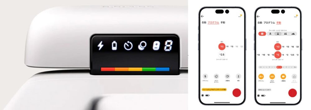 フリップした部分には小さなディスプレイが設けられており、バッテリー、ストロボ発光などの状態を目視できる。また、スマホアプリを連携させれば、手動でフォーカスレンジを切り替えたり、絞りやシャッタースピードを変えたり、二重露光を行なったりできる。