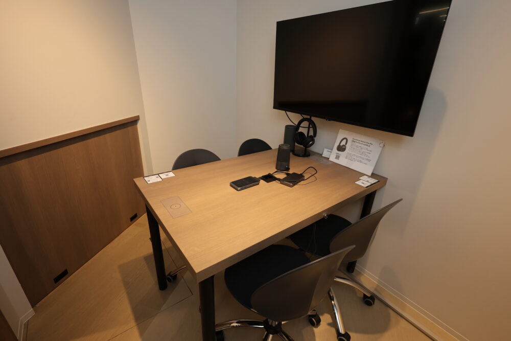 3部屋の1人用ビデオ会議ルーム(160円/15分)と、1つの4人用の会議室(480円/15分)も設けられている。外出先でビデオ会議に出ないといけない状況は少なくないので、これはありがたい。1人用の部屋は1時間使っても640円という価格も嬉しい。4人用の部屋も会議室としては破格値だろう。