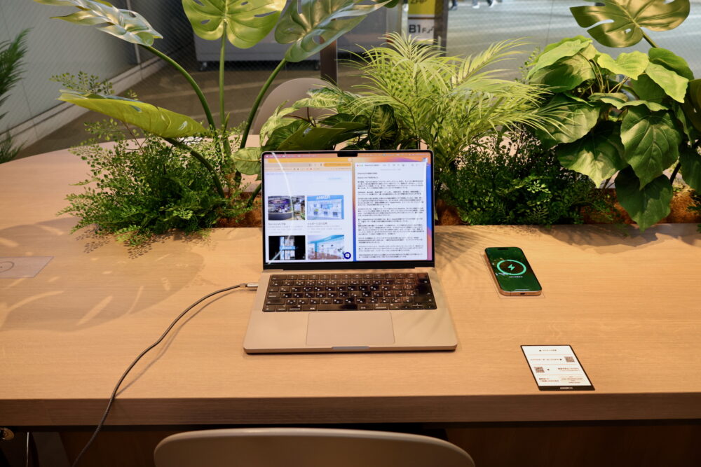 各テーブルには、AC電源に加えて、2本の充電ケーブルと、机に埋め込み式の非接触充電器が備え付けられている。充電ケーブルはUSB-Cが2本出ている席と、USB-CとLightningが出ている席があったので、座る際には自分のデバイスに合わせて選ぶようにしよう。