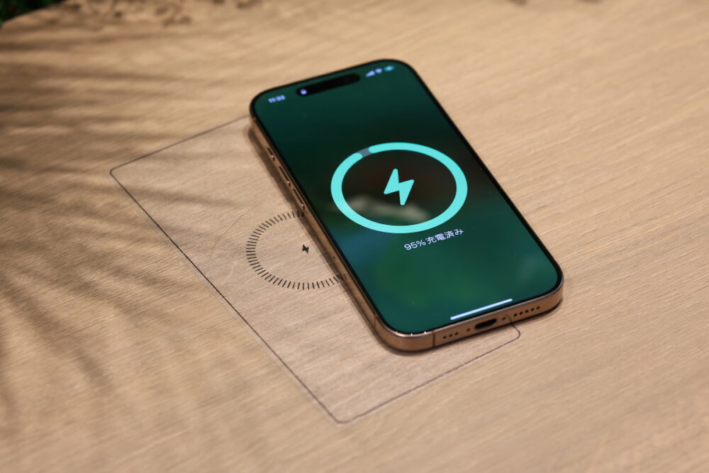 非接触充電器は机の上にシールが貼られている部分に埋め込まれている。AnkerのQi2対応マグネット式ワイヤレス充電器が入って要るとのことで、対応したiPhoneであれば最大15Wで充電可能。