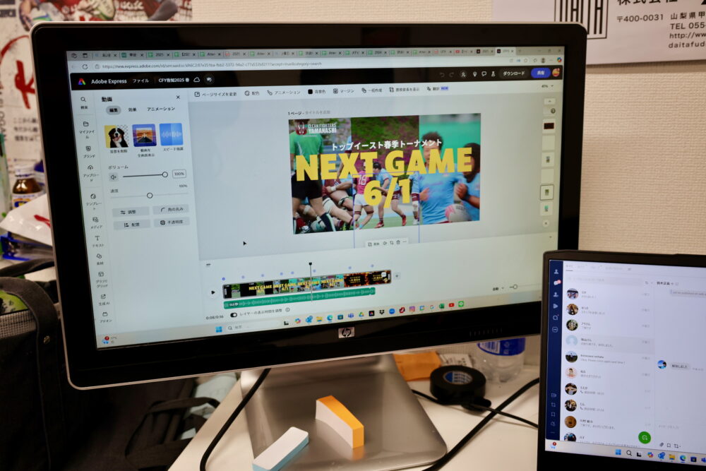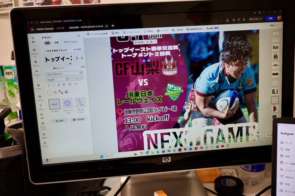会場ではアストロビジョンにAdobe Expressで編集した次の6月1日の重要な試合、JR東日本との試合の予告が流れる。