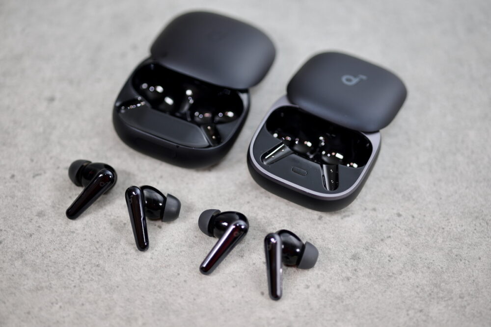 上位モデルであるSoundcore Liberty 4 Pro(左)と、本機、Liberty 5を比べてみると、音質はLiberty 4 Proの方がバランスが良く繊細。Liberty 5は低音の響きがしっかりしたタイプ。どんな音楽を聴くかにもよるかもしれないが、筆者はLiberty 4 Proの方が好み。ただし、混雑した電車の中でビートの効いた音楽を聴くようなシチュエーションだとLiberty 5も悪くないと思う。