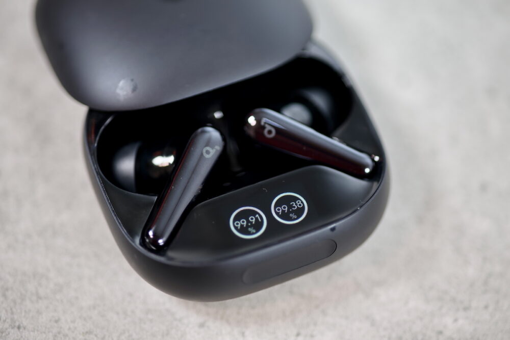 Liberty 4 Proのケースにはバッテリー残量などを表示できるディスプレイが付いていたり、本体もタッチバー装備で、ノイズキャンセリングや外音取り込みの強度を調整できたりする。