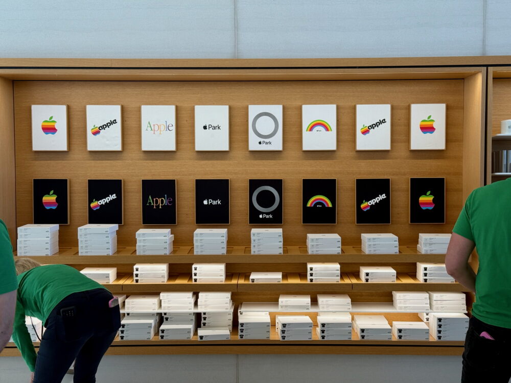 ここでしか買えないとなると欲しくなるが、Tシャツ一枚40ドル。税込で約6500円と高価なので、なかなか買えない。古いデザインには一切こだわらないアップルだが、ここだけは虹色リンゴや旧ロゴなどがしっかりと使われているのが面白い。