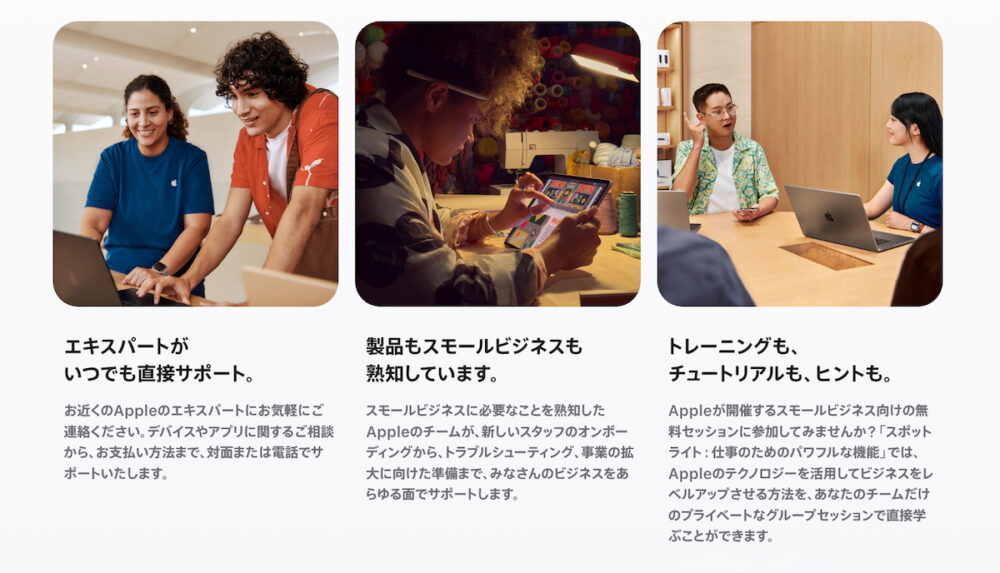 アップルの『スモールビジネスチーム』は、スタートアップなどの小規模企業が相談できるチーム。ビジネス向けストアで機材を購入できたり、エキスパートがトラブルシューティングを手伝ってくれたり、スタッフのトレーニングを手伝ってくれたりする。