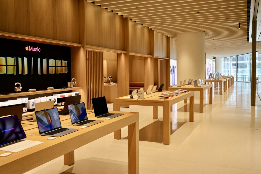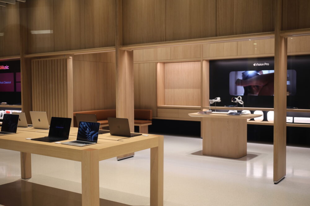 スペースは入り口から逆T字型となっており、正面にはジーニアスバーや、ピックアップなどの顧客対応テーブル、左翼にiPhoneやAirPodsの展示、右翼は長く伸びて、MacやiPad、Apple Watchの展示テーブルがある。Vision Proの体験エリアがあるのもこちら。