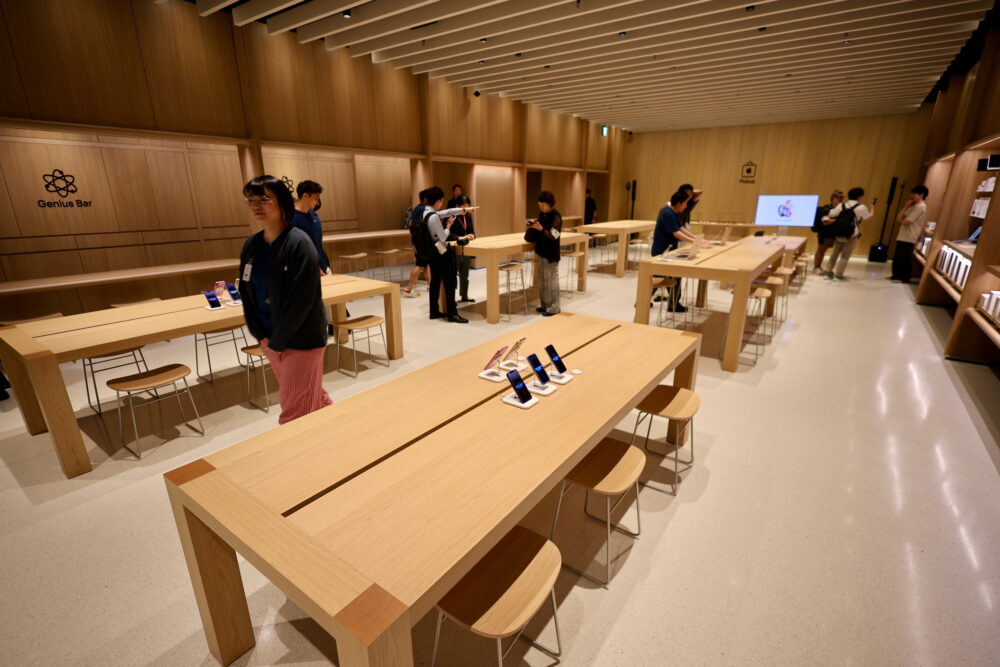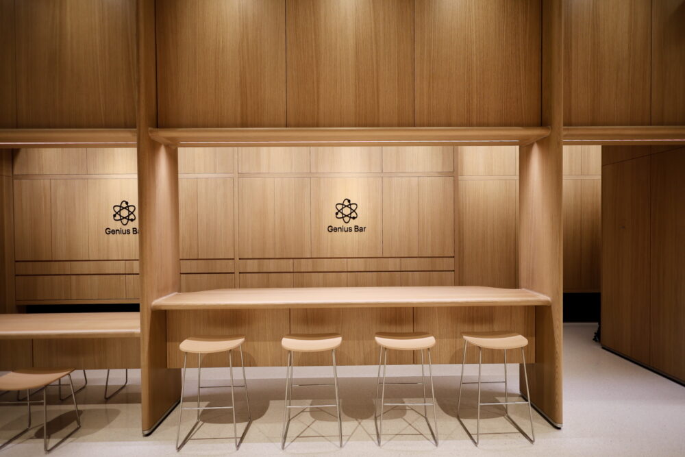 逆T字型の縦棒の奥左側はジーニアスバー。こちらも、高いテーブルと低いテーブルが用意されている。モジュールを組み合わせたような店舗デザインは最新のもの。