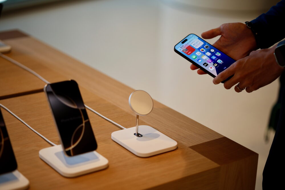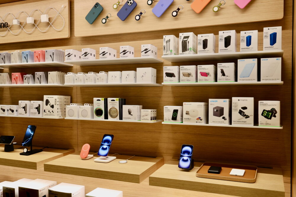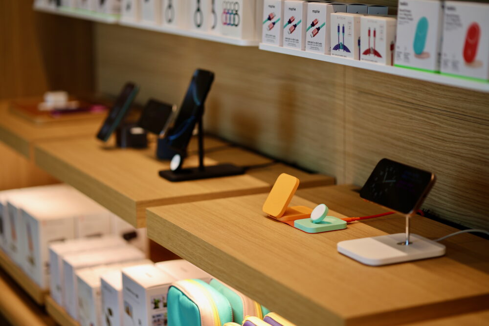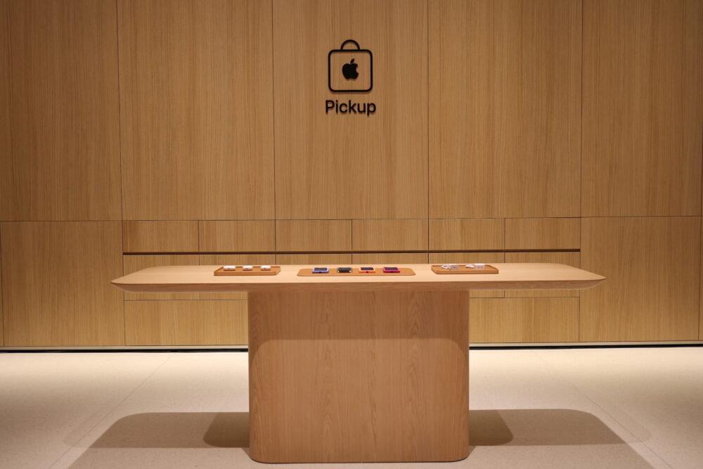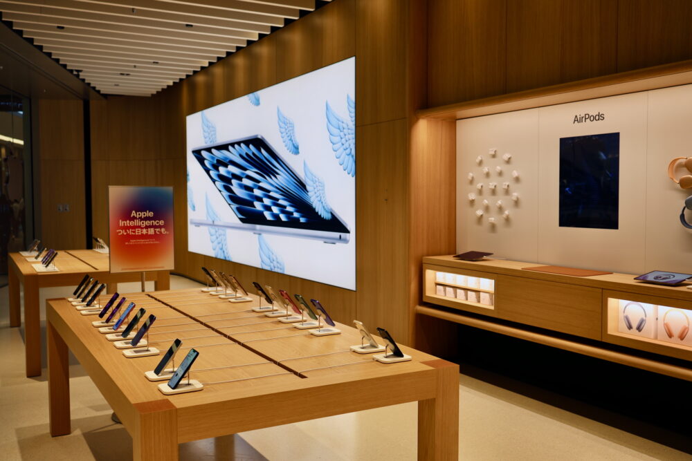 入ってすぐ左の左翼側は、iPhoneやAirPodsが並ぶ。奥行きの取れない一番奥は、大きな看板になっている。