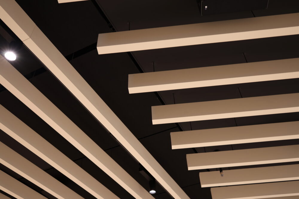 天井といえば、この店舗の天井は天然の木材をルーバー用に渡してあって、音の反射の少ないデザインとなっている。