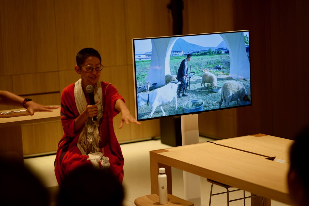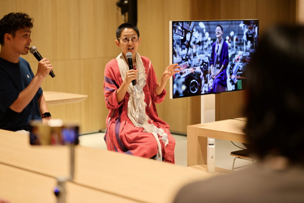 この、ナチュラルな色合いの衣装をまとった女性が玉木新雌さん。播州織のメーカー『tamaki niime』を起業した人物である。聞き手はApple梅田のクリエイティブプロのNaoyaさん。