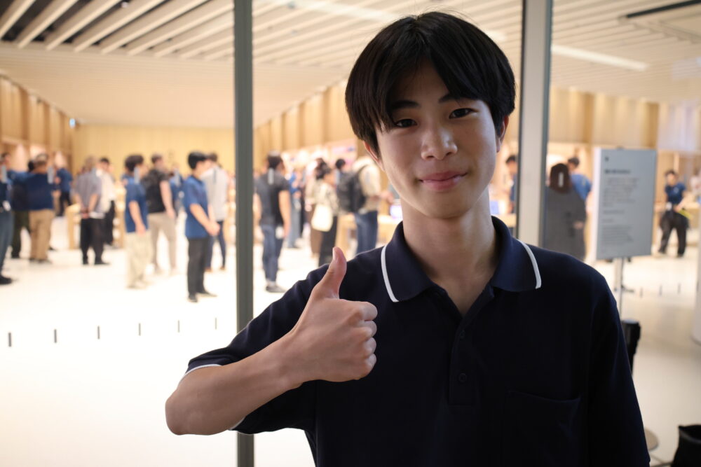 今回の一番乗りは藤本健太さん。枚方から来た16歳の高校生! iPhoneやiPadを使うアップルファンで、ご両親の許可を取って行列に来たそう。ご両親、理解あってすばらしい!