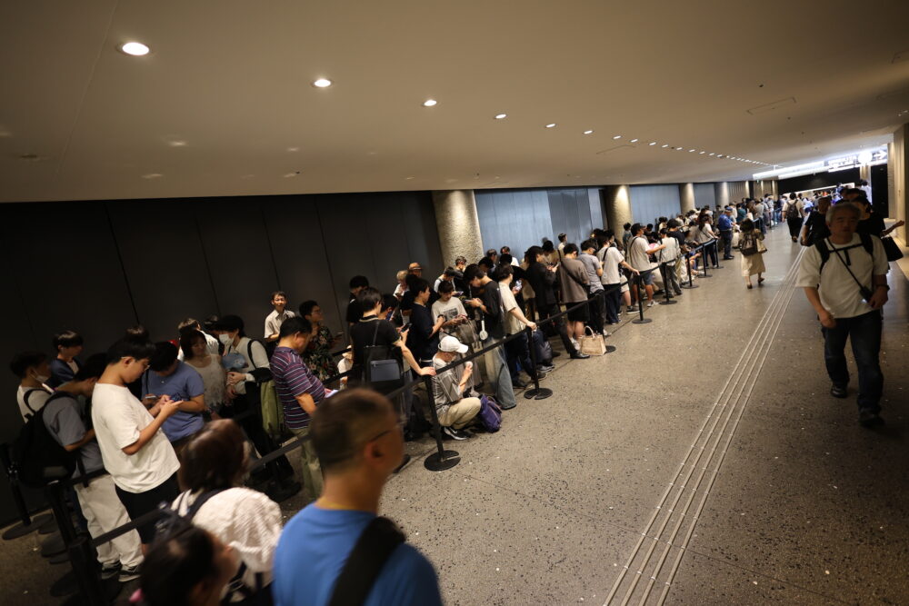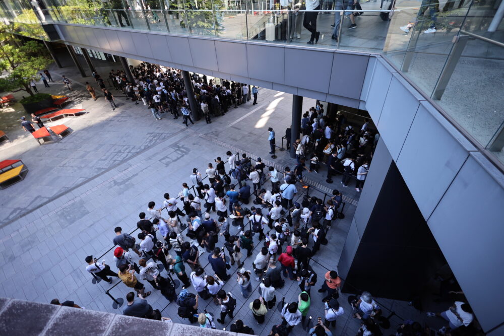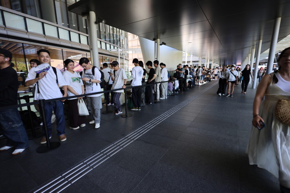 アップル自体も行列には慣れたもので、並ぶ場所についてはおそらく事前に詳細に地元商業施設と打ち合わせ済み。警備員の方が立ち、ポールによって整理されている。ブロックごとに区切られて、通路を遮るところや、階段には並ばないようになっている。このあたり、大昔のiPhone 3Gや3GS時代の行列とは大きく違う。