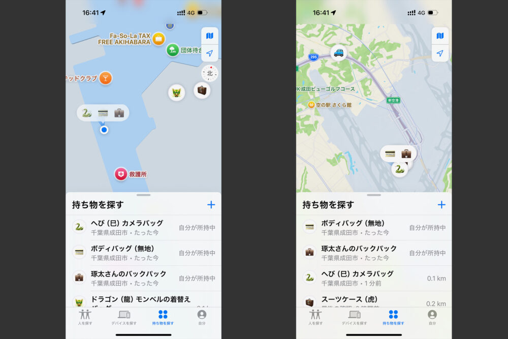 筆者は、持ち歩くすべてのバッグにAirTagを付けている。預け入れのスーツケースにも付けているので、預けていてもスーツケースがどこを移動しているか、だいたい分かっている。また、車にも入れてあるので、駐車場に置いた車の位置も分かる。止めた場所を忘れてしまっても(立体駐車場でなければ)見つけることができる。