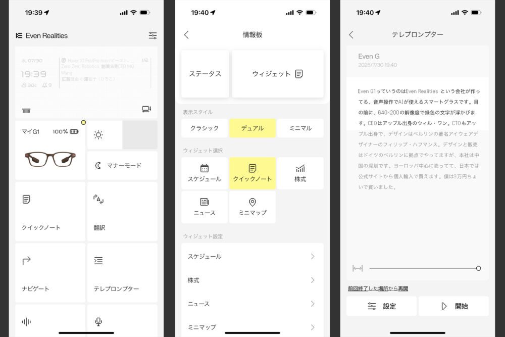 プレゼンに使うのもいいが、実践投入するには問題がある。まず、まだEven G1自体の動作が完全に安定的ではないという点。一度、プレゼンの途中で、文字送りがフリーズしてしまった。