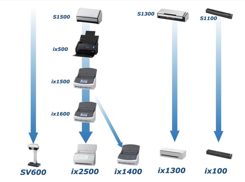 そうすると、S1500→iX500→iX1500→iX2500という進化も理解できるし、S1300→iX1500、S1100→iX100、SV600、iX1400という商品に関しても理解できる。