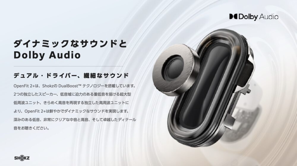 特徴的なのは、異なるサイズ、形状のドライバーを同軸で配置したShokz DualBoostテクノロジーを利用している点。低周波ユニットは17.3mmの大型ダイナミックユニットで深みのある低音をサポート、高周波ユニットはそれと独立しており、デリケートな中低音をしっかりと奏でるようにチューニングされている。