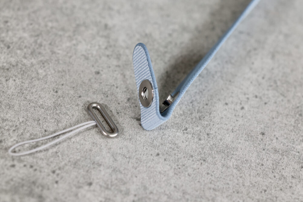 ストラップの端は金属のホック(AirTagのレザーケースで使われているタイプ)で外れるようになっており、そこにストラップホールに通す先端部分を組み込むようになっている。このホックはかなり固くて、よほどのことがない限り外れることはなさそう。